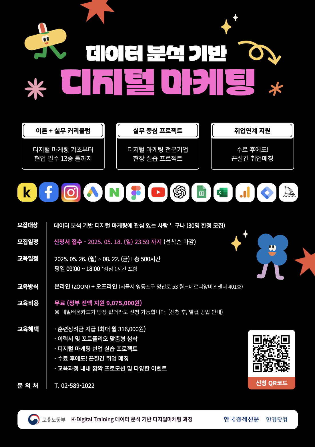 가. 프로그램명: 한경닷컴 디지털 마케팅 부트캠프 나. 모집대상: 디지털 마케팅에 관심있는 누구나다. 모집기간: 25. 05.18(일) 23:59까지 라. 교육시간: 평일 09:00 ~ 18:00 (8H, 점심시간 1시간 포함) 마. 교육비용 : 무료 (9,075,000원 정부 전액 지원) 바. 신청 방법 : 온라인 신청 (https://bit.ly/44eUDoj) 사. 문의처 : 02-589-2022