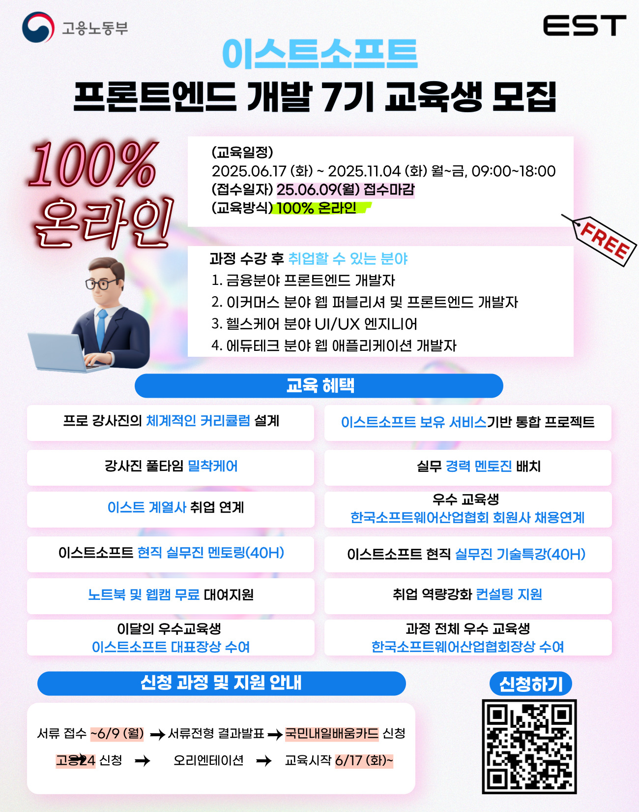* 혜택 : 우수교육생 이스트계열사 취업연계, 현직 멘토링, 실무특강, 무료 교육, 노트북 무료 지원 등