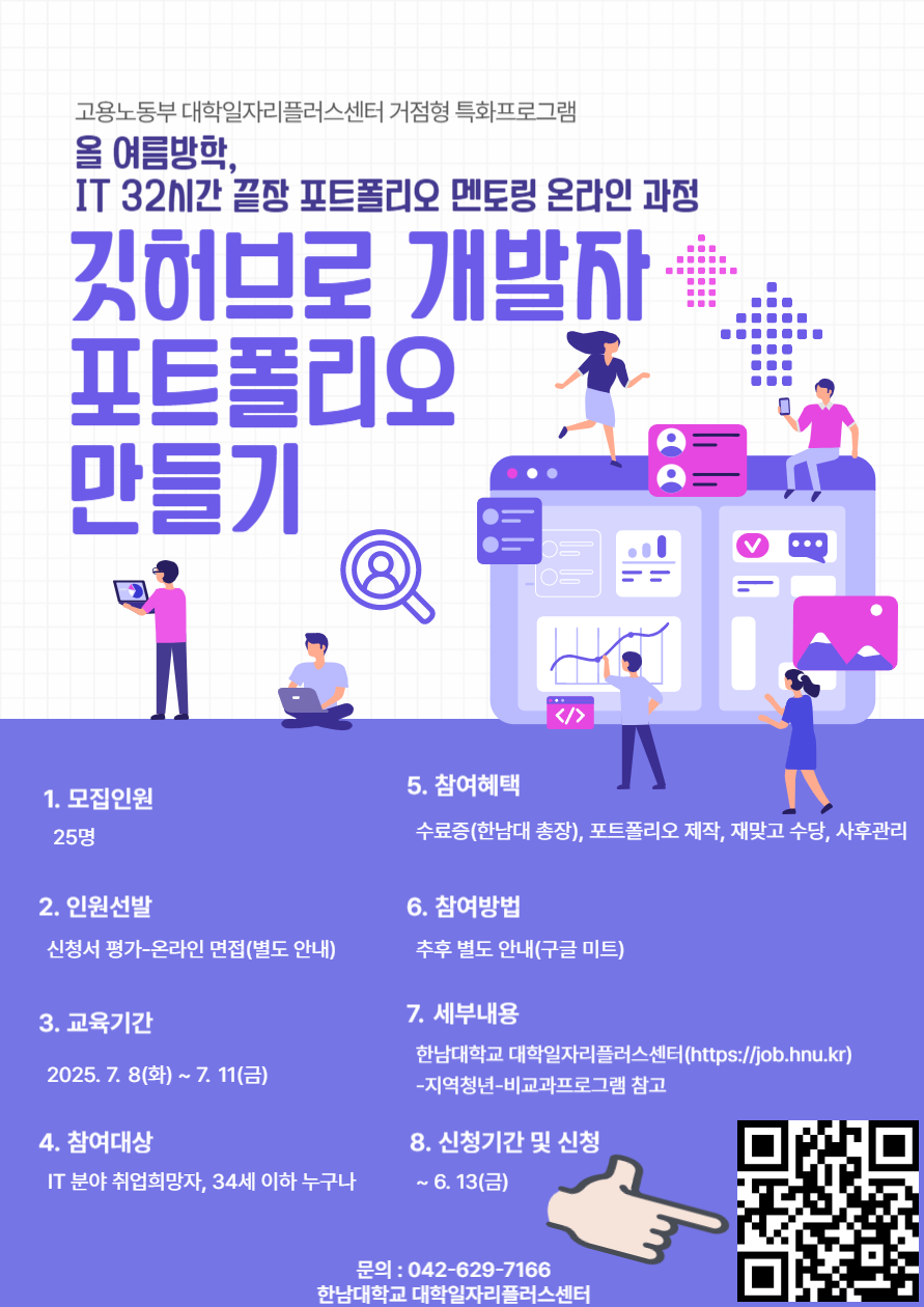 나. 참여방법 : 온라인 교육 다. 운영 대상 : 34세이하 청년(타대학 졸업생, 졸업예정자, 고학년 환영) * 15세~34세 이하 누구나 지원가능 라. 모집인원 : 25명 마. 신청방법 및 선발 1) 신청기간 : ~ 6. 13(금), 신청자가 많을 경우 조기 마감 가능 * 본 과정은 경쟁률이 높은 과정이므로 반드시 100% 참여가 가능한 분만 신청 2) 신청방법 : 네이버설문폼 / https://naver.me/5yPZ13j7 3) 면접기간 : 2025. 6. 9. ~ 6. 25, 온라인 면접 * 1차 합격자에 대해 별도 안내 예정 4) 선발발표 : 2025. 6. 30(월)까지(날짜 변경 가능, 개인 이메일 확인) 5) 선발기준 : 전공적합성, 지원동기, 교육후 계획, 기타(어학, 자격, 학점) 종합 고려