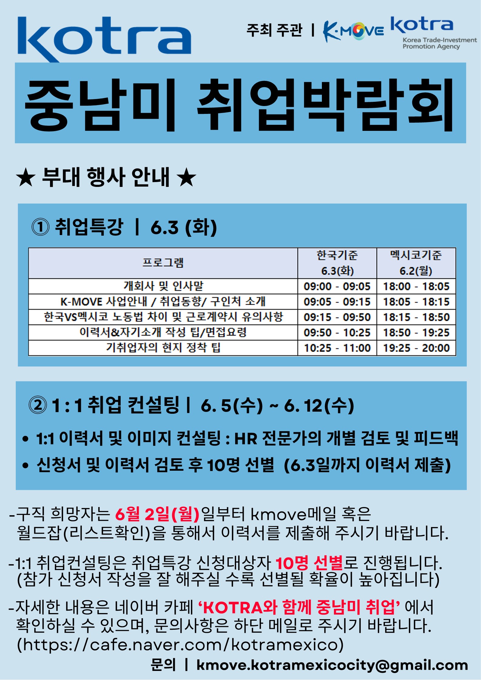 < 2025년 중남미 취업박람회 > ㅇ 일시 : 2025년 6월 3일 ~ 7월 4일 ★취업특강 : 6월 3일(화) 오전 9:00 (한국시간기준) / 6월 2일(월) 오후 6시(멕시코시티시간기준) ㅇ 장소 : ZOOM 온라인 ㅇ 행사내용 : 기업-구직자 간 화상면접 주선, 구직자 대상 취업특강 및 1:1취업컨설팅 * 이력서 제출한 신청자분들 중 10명 선별하여 1:1 이미지 & 이력서 컨설팅 기회 제공 * 신청링크 : https://forms.gle/gJ7SiENfzp8tmMj16