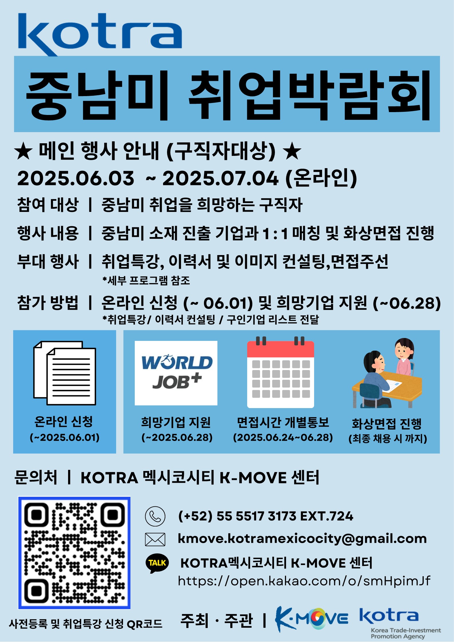 | 제목 | [KOTRA멕시코 K-MOVE 센터] 2025년 6월 온라인 취업박람회 | ||||