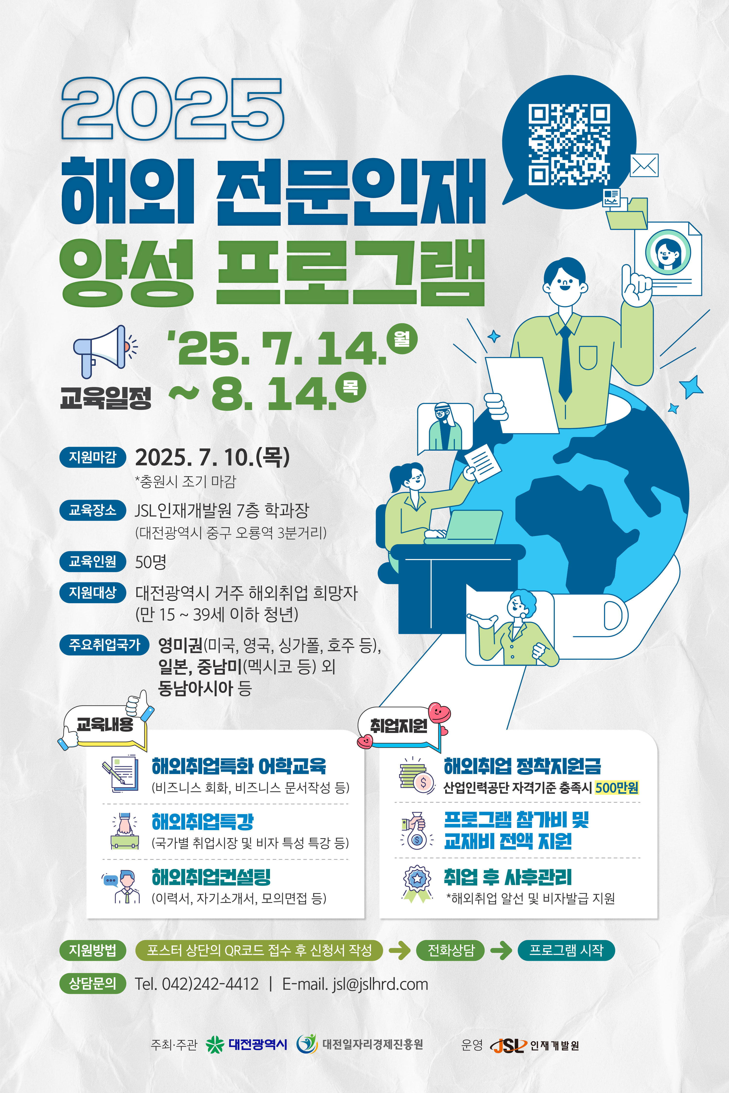 1) 프로그램명 : 2025 해외 전문인재 양성 프로그램 2) 지원내용 : 취업특화 어학교육 및 취업특강, 취업컨설팅, 취업알선 등 무료 지원 3) 지원대상 : 대전시 거주 중인 15세 이상 39세 이하 지역청년(주민등록상 거주지 기준) 4) 교육기간/장소 : 2024. 7. 14.(월) ~ 8. 14.(목) / JSL인재개발원(중구 계룡로 825, 희영빌딩 7층) ※ 일본권 및 영미권 과정(영어권) 운영(선택) / 오전반(09:30 ~ 12:20) 및 오후반(14:00 ~ 16:50)