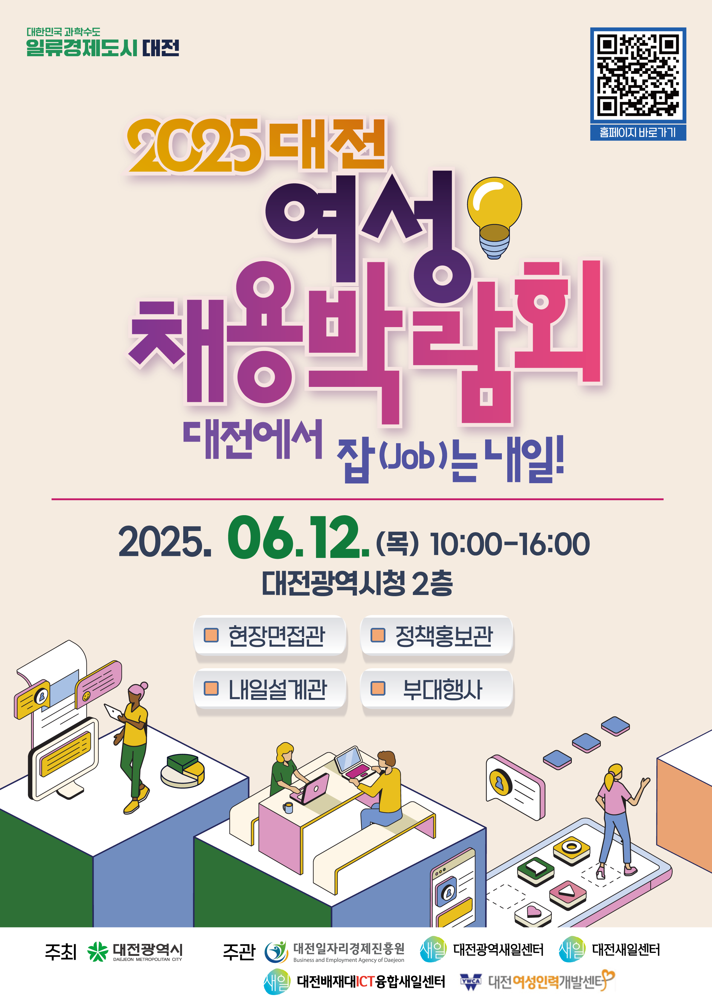 가. 행 사 명: 2025 대전여성채용박람회 나. 일시/장소: 2025. 6. 12.(목) 10:00 ~ 16:00 / 대전시청 2층 ※공식홈페이지 : https://대전여성채용박람회.com