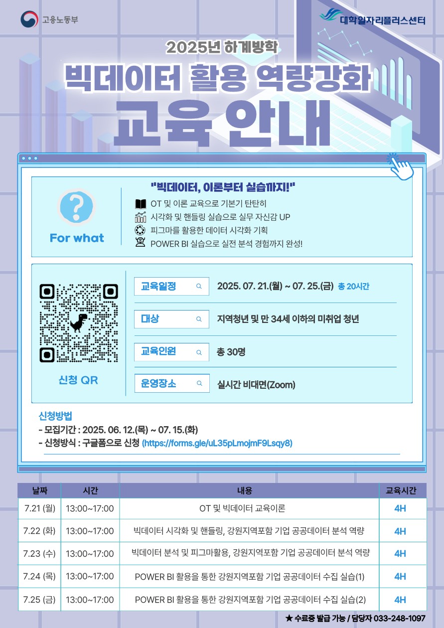 프로그램 개요 프로그램명: 2025년 하계방학 빅데이터 활용 역량강화 교육과정 대상: 지역청년 및 만 34세 이하의 미취업 청년 교육일시: 2025. 07. 21.(월) ~ 07. 25.(금), 총 20시간 교육장소: 실시간 비대면(Zoom) 교육인원: 30명 신청방법 - 모집기간 : 2025. 06. 12.(목) ~ 07. 15.(화) - 신청방식 : 구글폼으로 신청(https://forms.gle/uL35pLmojmF9Lsqy8) 프로그램 교육 내용