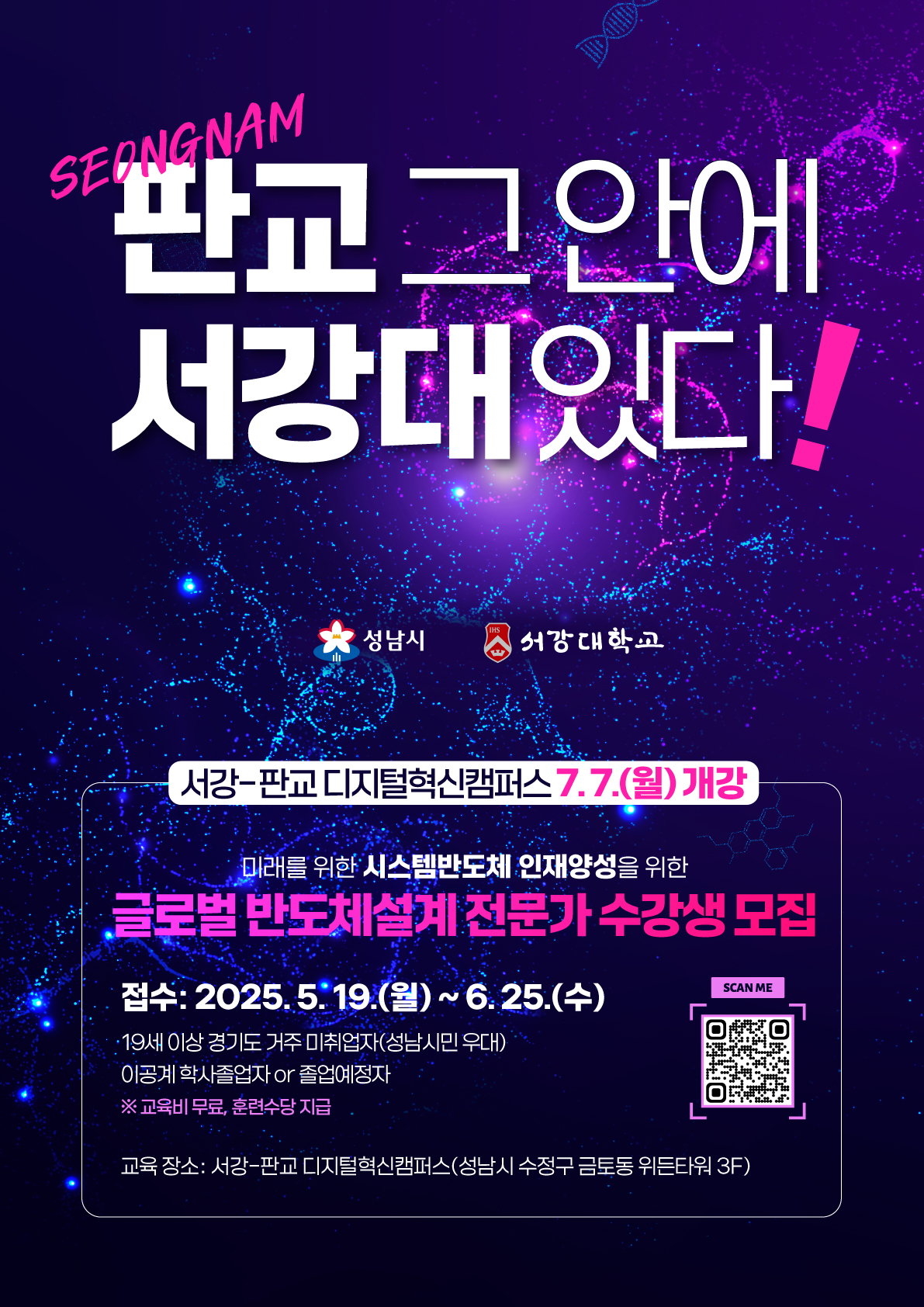 □ 모집기간: 2025. 5. 19.(월) ~ 6. 25.(수) □ 모집인원: 40명 □ 신청자격 ○ 경기도 거주, 19세 이상 미취업자 ○ 이공계열 학사졸업자 혹은 졸업예정자 □ 신청방법: 서강 시스템반도체 설계교육센터 홈페이지 모집요강 확인 후 이메일로 서류 제출 (https://scc.sogang.ac.kr/sgsdecenter)