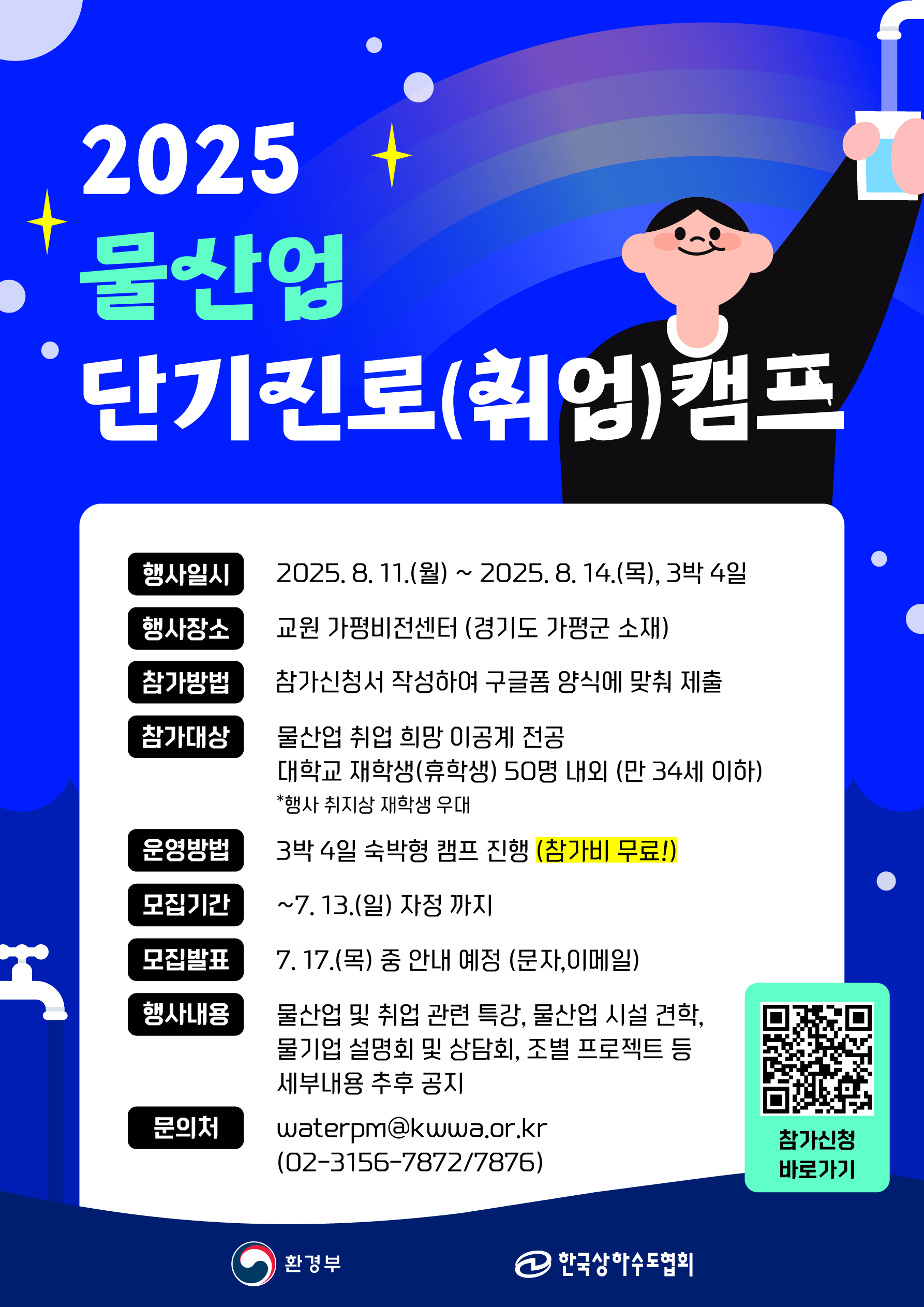 가. 행 사 명: 2025년 물산업 단기 진로(취업)캠프 나. 행사기간: 2025.8.11.(월) ~ 8.14(목), 3박 4일 다. 행사장소: 교원 가평비전센터(경기도 가평군 소재) 라. 모집기간: 2025. 6. 26(목) ~ 7. 13(일) 자정까지 마. 교육내용: 물산업 특강, 물기업 소개(인사담당자), 자기소개서?면접 특강, 물시설 견학 등 바. 참여혜택: 참가비 전액 지원, 환경부 물산업 미래인재 양성과정 선발 우대, 수료증 발급 등 사. 신청방법: 참가신청서 작성 후 구글폼 제출(홈페이지(waterpm.kwwa.or.kr) 공지사항 참고)