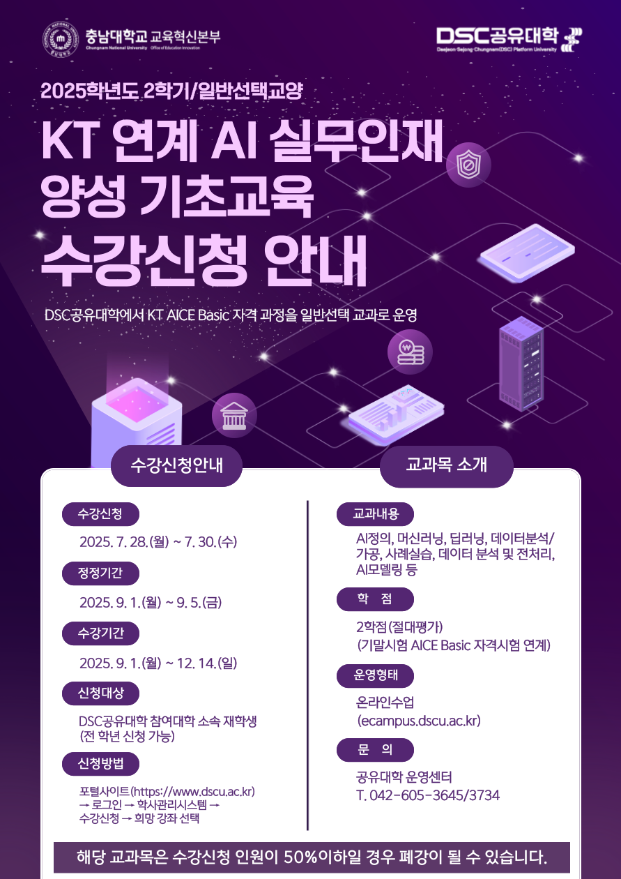 가. 교과목명: KT연계 AI실무인재 양성 기초교육(일반선택 교양교과) 나. 수강신청 안내 1) 신청기간: 2025. 7. 28.(월) ~ 7. 30.(수) 2) 정정기간: 2025. 9. 1.(월) ~ 9. 5.(금) 다. 수강기간: 2025. 9. 1.(월) ~ 12. 14.(일) 라. 학 점: 2학점(기말시험 AICE Basic 자격시험 연계) 마. 신청방법: 포털 사이트(https://www.dscu.ac.kr/) 접속 → 로그인 → 좌측 상단 학사관리시스템 접속 → 수강신청 → 희망 강좌 선택