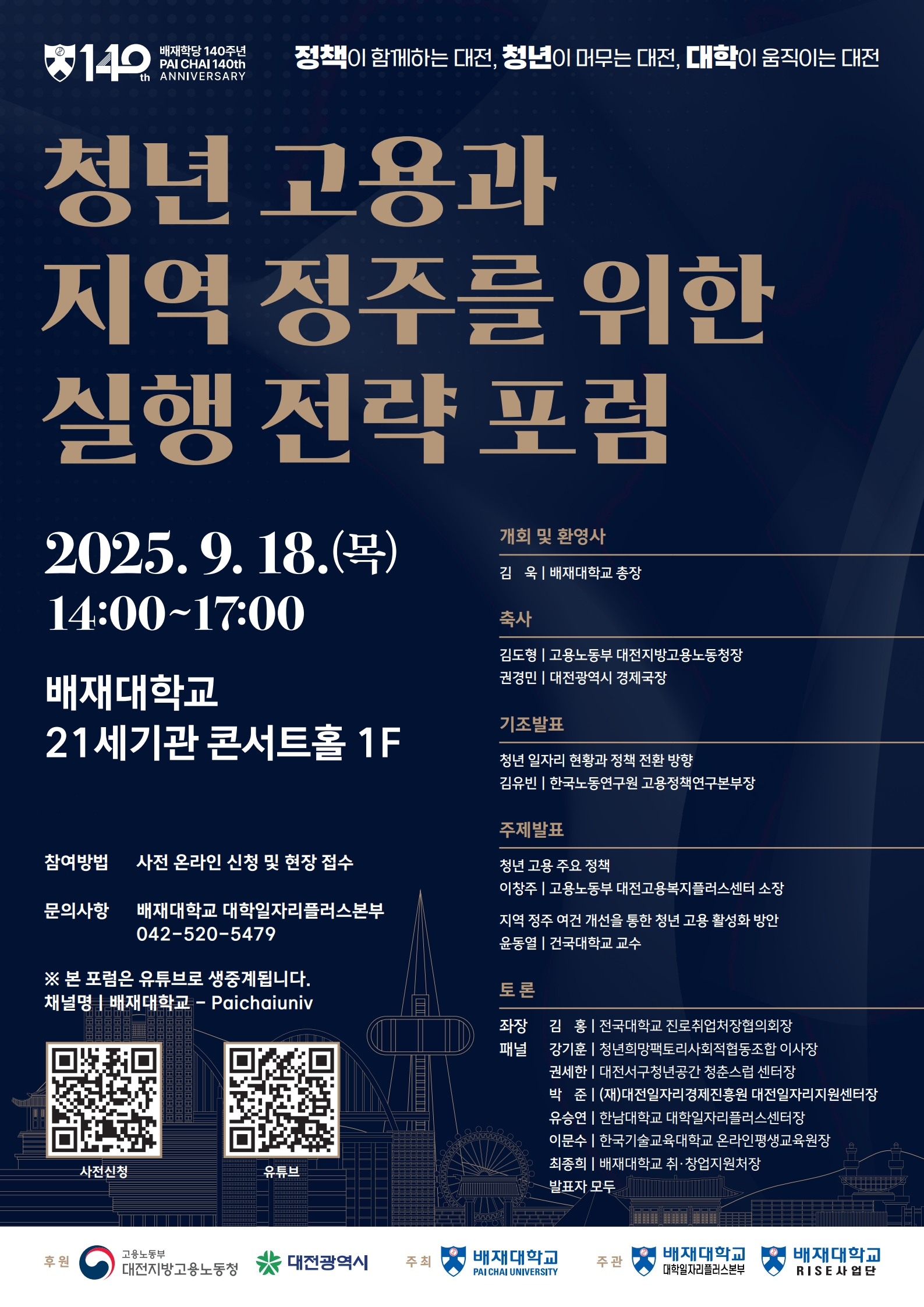 가. 행 사 명: 청년 고용과 지역 정주를 위한 실행 전략 포럼 나. 일 시: 2025. 9. 18.(목), 14:00 ~ 17:00 다. 장 소: 배재대학교 21세기관 1층 콘서트홀 라. 참여대상: 재학생 및 졸업생, 지역 청년 등 마. 주요내용 - 청년 고용정책의 방향과 지역 정주 실행 전략 발표 - 청년 고용과 지역 정주를 촉진하기 위한 대학의 실행력 제고 방안 토론 바. 사전신청: 구글폼 https://forms.gle/8dutVF3jY4oi4feb6 (포스터에 QR코드 참고)