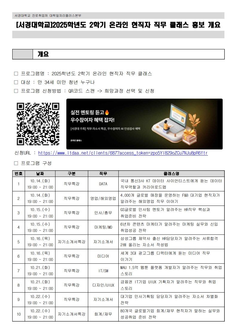 제목 2025학년도 2학기 온라인 현직자 직무 클래스