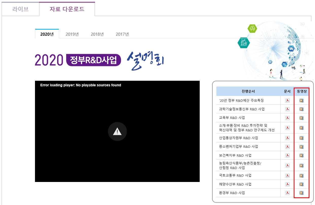 한국과학기술평가원이 주관하고 각 부처별로 주최하여 진행한 "2020년 정부R&D사업 부처별 합동 설명회" 자료를 각 부처별로 목차에서 확인이 가능하시도록 업로드하오니 해당 자료를 참고하시어 정부R&D 사업에 많은 관심 부탁드립니다. 1. 제목: 2020년 정부R&D사업 부처별 합동 설명회 2. 주관: 한국과학기술기획평가원 3. 주최: 과학기술정보통신부, 교육부, 국토교통부, 농림축산식품부, 농촌진흥청, 보건복지부, 산업통상자원부, 중소벤처기업부, 해양수산부, 환경부,산림청 4. 비고 - 수도권에서 진행한 2020년 정부R&D 설명회 생중계 동영상도 http://castmedia.kr/live/kistep/ 에서 시청가능하니, 같이 활용하시기 바랍니다. [동영상 시청 방법]