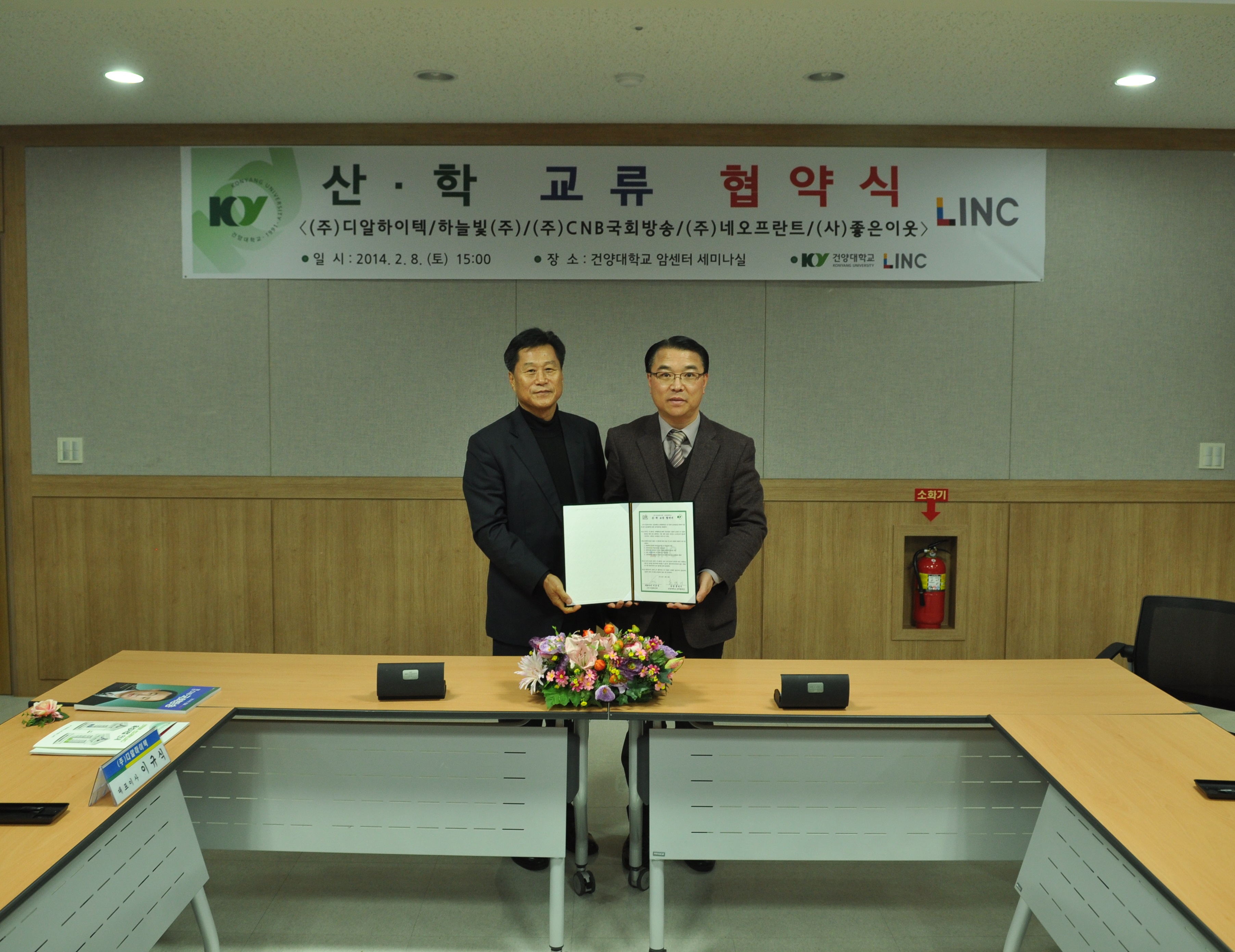 (주)디알하이틱과 건양대학교 협약체결- 일자 : 2014.02.08(토) - 장소 : 건양대학교 암센터 세미나실 - 협약내용 : 1. 관력학과 학생의 현장실습지원 및 취업연계 지원 2. 산업정보 및 학술정보의 상호교환 3. 정책자문, 공동연구 등 양 기관의 발전에 필요한 사항 4. 공동 관심분야의 연구개발 및 기술 이전 5. 산학협력을 통한 양 기관의 사업 참여 협조 및 인적교류 확대 |