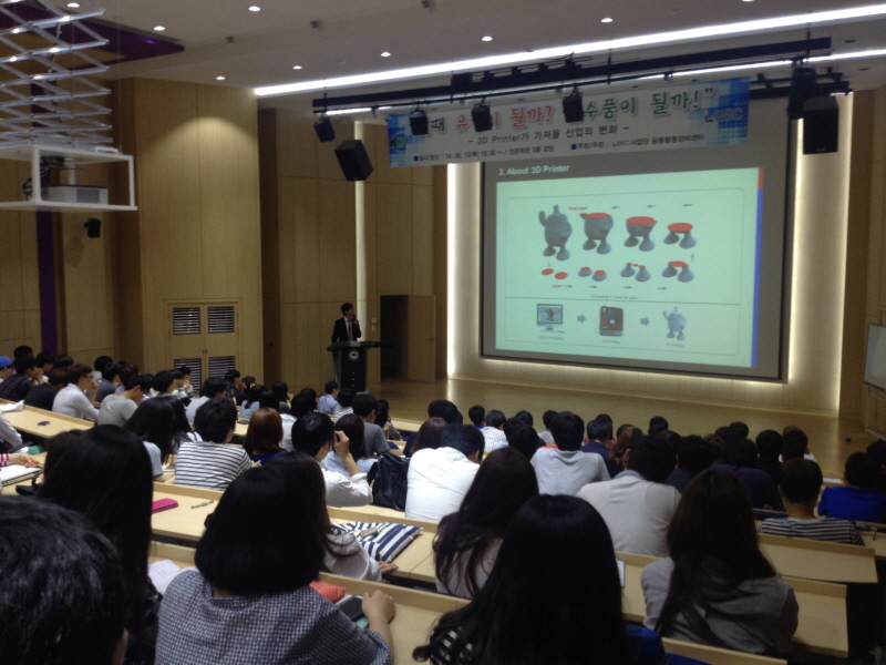 - 일시 : 2014. 6.12(목) 15:30~- 장소 : 인문학관 3층 강당- 강사 : (주)한국기술 이일용 과장- 참석 : 166명 (재학생 및 기타)- 주제 : 3D Printer 가 가져올 산업의 변화