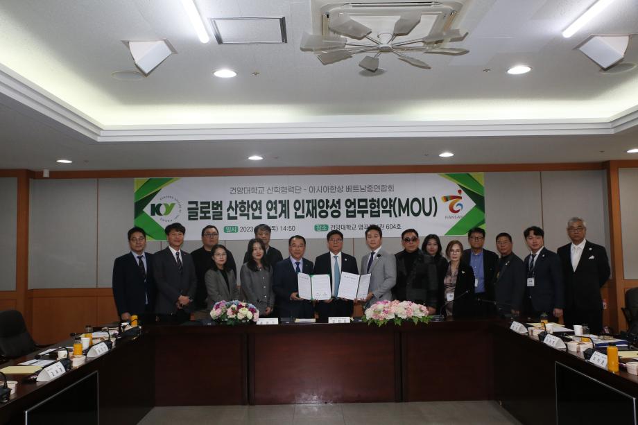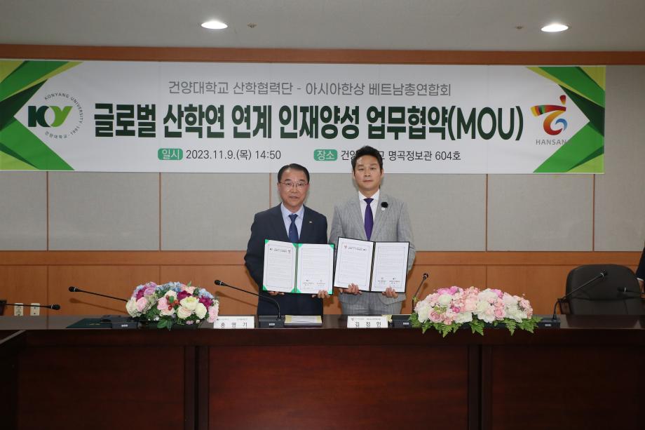 건양대학교(총장 김용하) 산학협력단(단장 홍영기)과 아시아한상 베트남총연합회(회장 김정민)가 9일 오후 건양대 창의융합캠퍼스 명곡정보관에서 글로벌 우수인재양성과 공동관심분야 협력체계 구축을 위한 산학연 업무협약을 체결했다.아시아한상 베트남총연합회는 베트남 지역에 활동하고 있는 한상을 연합해 관할하며, 아시아 지역의 한인동포의 경제사회를 대표하는 단체다.