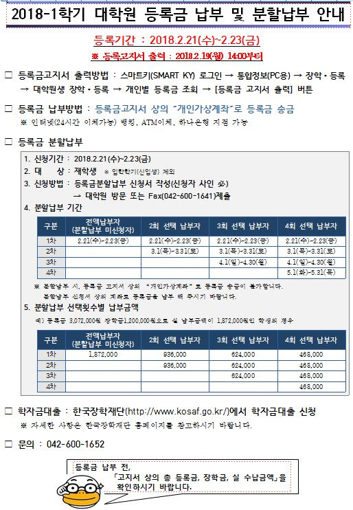 | 제목 | 2018-1학기 등록(분할납부)기간 안내(재학생) | ||||