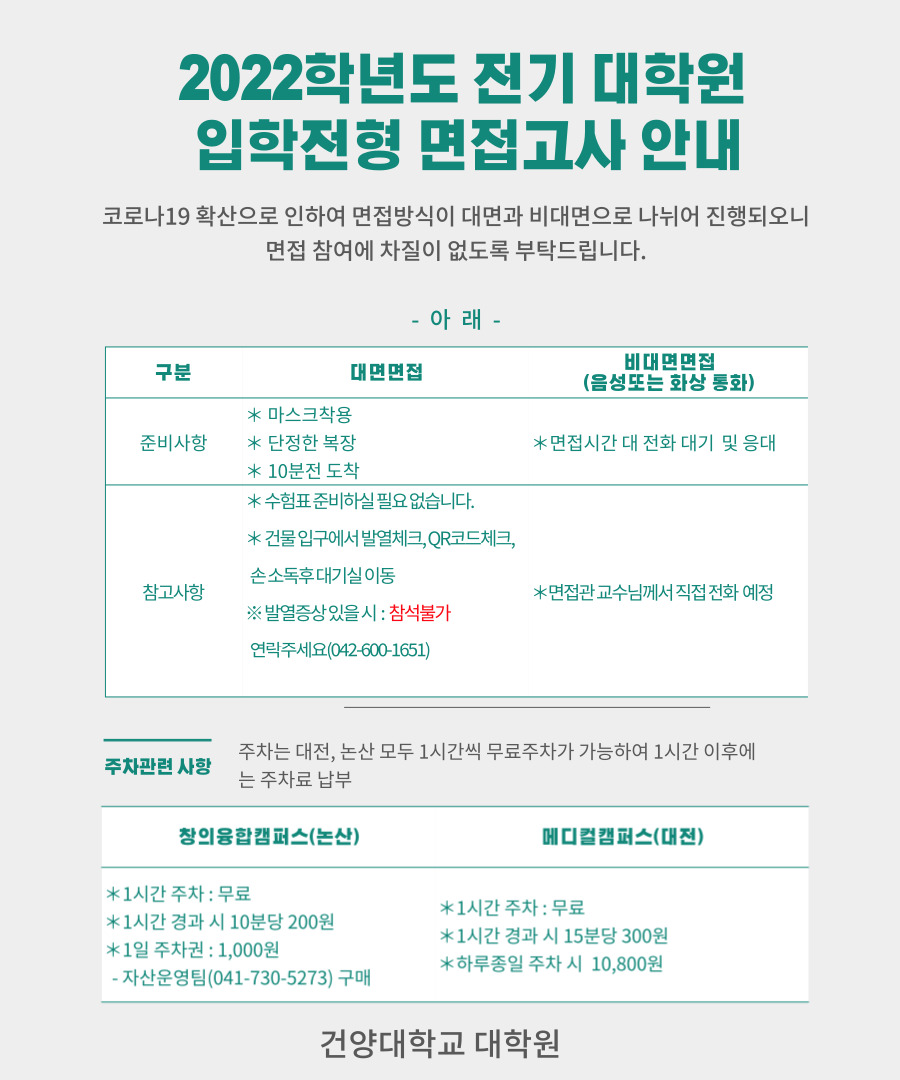 | 제목 | 2022학년도 전기 대학원 입학전형 면접고사 안내 | ||||