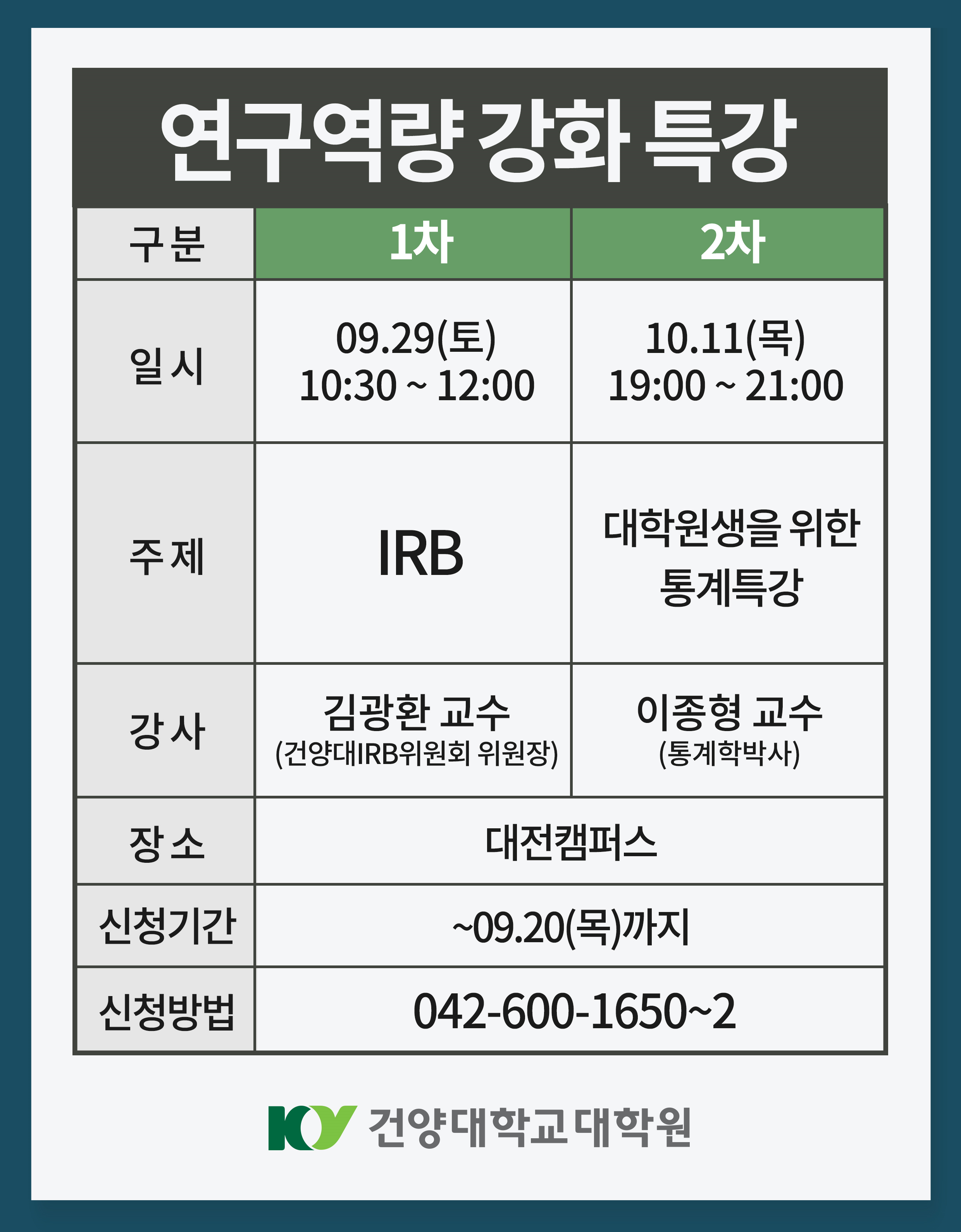 <유의사항> 10월 11일에 시행하는 통계특강의 경우 추후 연구윤리관련 교육이수증으로 인정되지 않습니다.