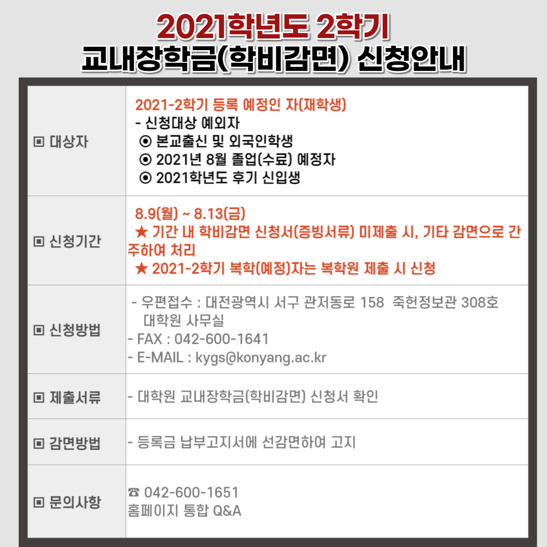 | 제목 | 2021학년도 2학기 학비감면 장학신청 안내 | ||||