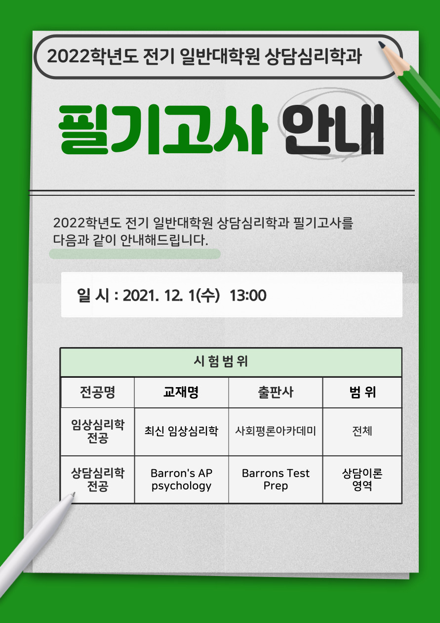 | 제목 | 2022학년도 전기 일반대학원 상담심리학과 필기고사 안내 | ||||