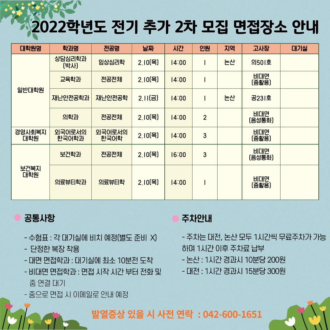 | 제목 | 2022학년도 전기 추가 2차 입학전형 면접 안내 | ||||