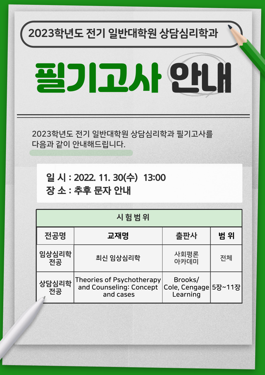 | 제목 | 2023학년도 전기 일반대학원 상담심리학과 필기고사 안내 | ||||