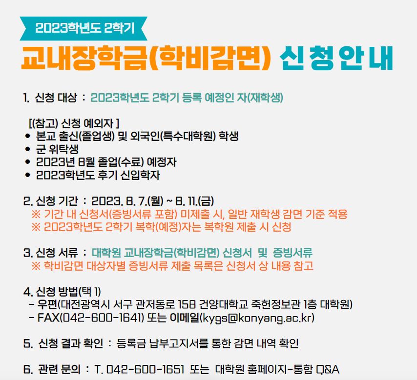 | 제목 | 2023학년도 2학기 교내장학금(학비감면) 신청 안내 | ||||||||||