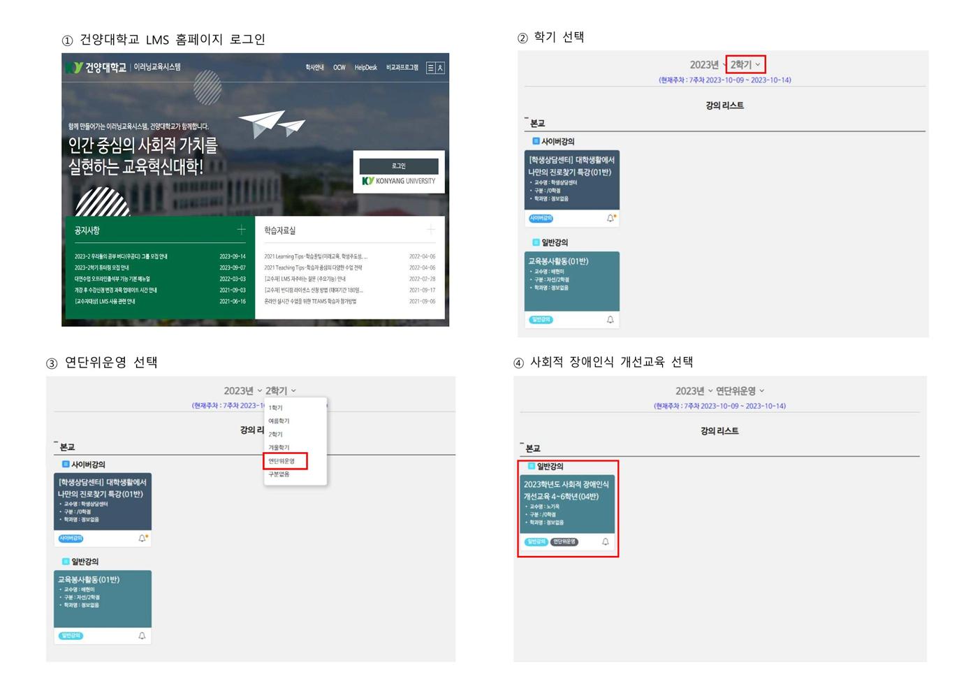 1. 교과목명 : 2023학년도 사회적 장애인식 개선교육 2. 담당교수 : 노기옥 교수 3. 수강기간 : ~12.31(일) 4. 수강방법 : LMS 강의 콘텐츠 수강