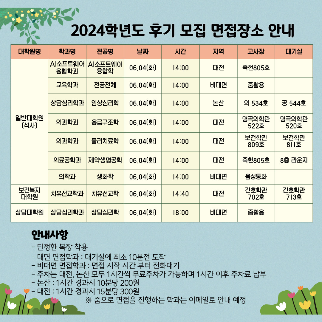 | 제목 | 2024학년도 후기 대학원 신입생 모집 면접 안내 | ||||