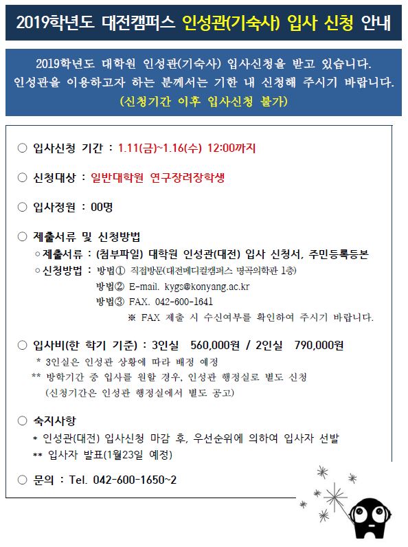 | 제목 | 2019학년도 대전캠퍼스 인성관 입사신청 안내 | ||||