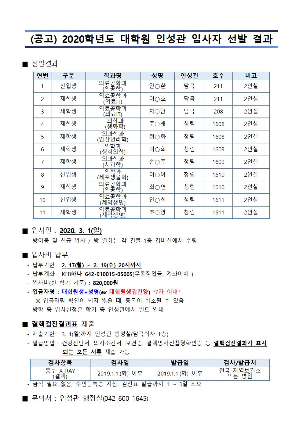 2020학년도 대학원 인성관 입사자 선발 결과를 붙임과 같이 공고하오니 확인부탁드립니다.