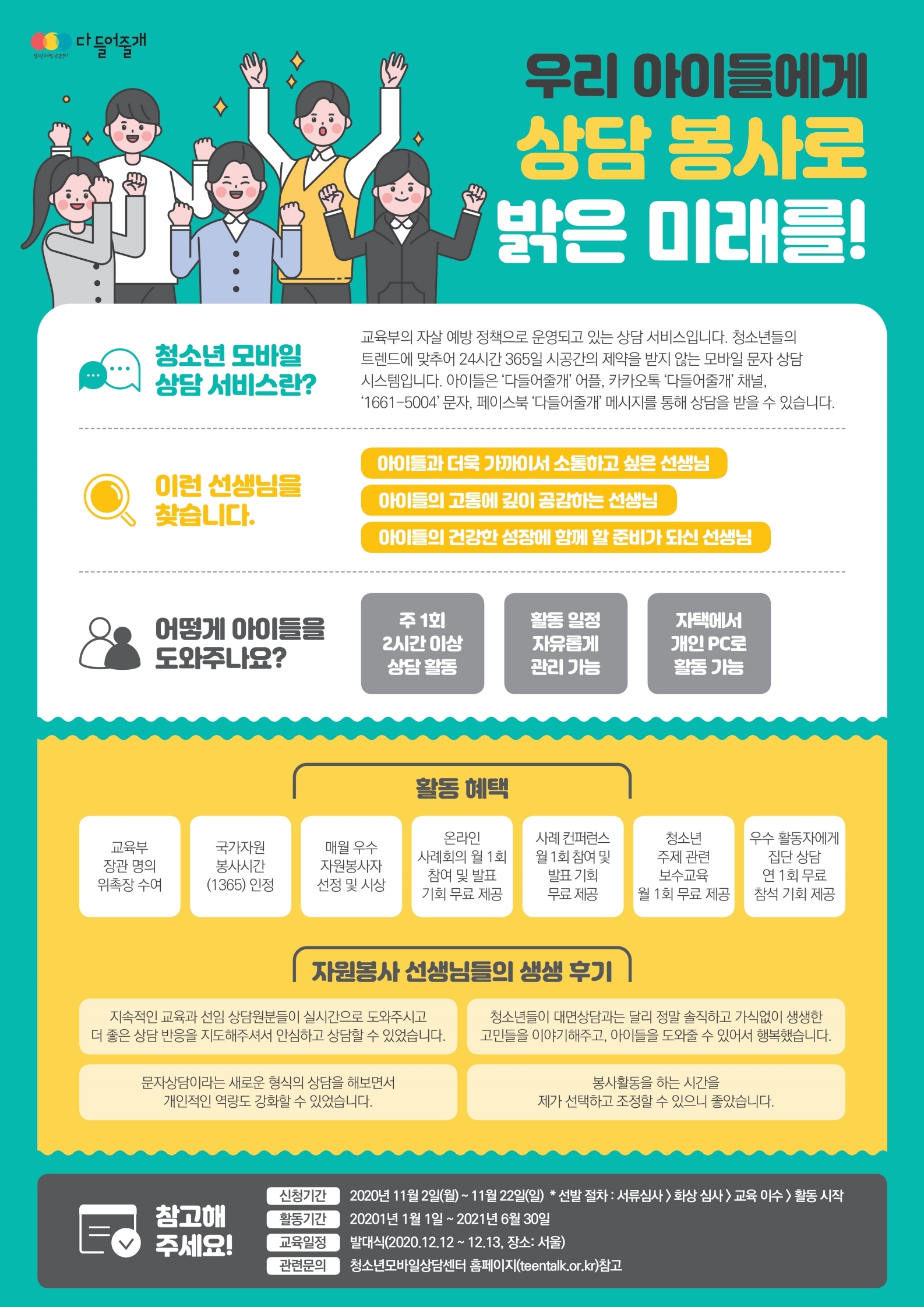 ■ 모집기관 : 청소년 모바일 상담센터 ■ 지원자격 및 기준 : 붙임참조 ■ 모집기간 : 11.2(월) ~ 11.22(일) ■ 신청방법 : 온라인 URL로 접수 ■ 문의 : 청소년 모바일 상담센터(02-582-1465) |
