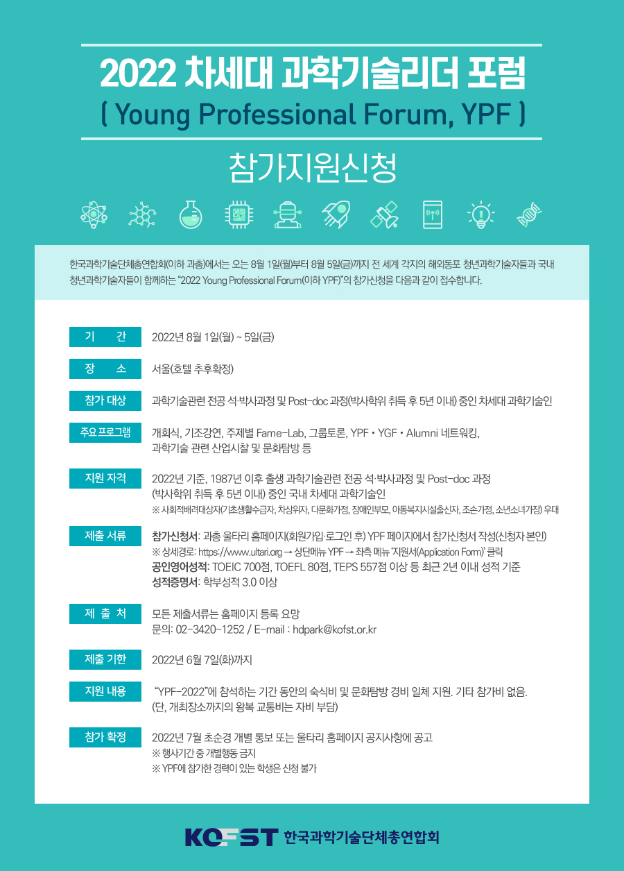| 제목 | 2022 차세대과학기술리더포럼(YPF) 국내참가자 모집 | ||||