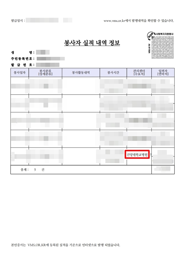 - 봉사활동 앞 뒷장 모두 업로드 되어야 하며, 발급번호 및 온라인확인번호가 명확히 보여야함 - 확인서 발급 시 PDF 파일로 변환이 가능하므로 가급적 PDF 파일로 업로드 (PDF파일 변환 방법 : https://www.konyang.ac.kr/cop/bbs/BBSMSTR_000000001514/selectBoardArticle.do?nttId=168639&kind=&mno=sitemap_02&pageIndex=1&searchCnd=&searchWrd= ) - 위 예시파일과 같이 봉사실적을 일괄 출력한 파일로 업로드 해도 인정 (일자별로 따로 파일을 만들어 업로드 할 필요 없음) - 통합정보시스템에 봉사기관을 '관리센터'로 입력
