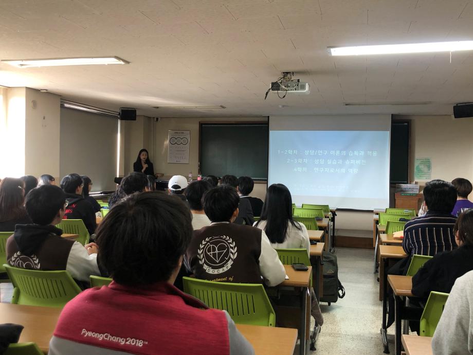 11월 7일 오후 1시 30분부터 심리상담치료학과의 홈커밍데이가 열렸습니다. 홈커밍데이는 졸업생과 재학생 간의 화합과 결속을 다지는 자리로, 현재 대학원을 다니시거나 다양한 현장에 계시는 선배님들의 강연으로 진행되었습니다. 이번 홈커밍데이는 강홍비(14학번), 유한별(14학번), 이수은(14학번), 김희주(12학번), 이덕희(11학번), 김가희(06학번), 최윤경(05학번), 안세윤(99학번) 선배님께서 자리해주셨습니다. 상담심리, 임상심리, 예술상담치료, 상담교육 등 다양한 분야에 계신 선배님의 조언과 평소 재학생들이 궁금했던 점에 대한 질의응답 시간을 가졌습니다. 홈커밍데이를 통한 선후배 간의 만남이 학과의 단단한 연대를 형성하고, 재학생들은 선배님들의 도움을 통해 한층 성장할 수 있는 유익한 시간이 되었습니다. |