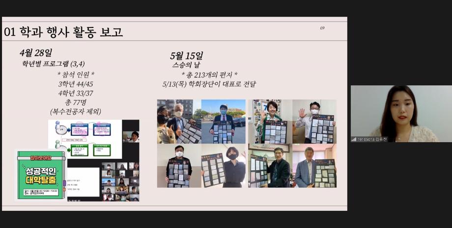 5월 24일 오후 4시 30분, 2021학년도 1학기 온라인 종강총회가 진행되었습니다. 이번 종강총회는 코로나19로 인해 직접 만나지 않고 ZOOM으로 진행되었으며 약 142명의 학우들이 참석하였습니다. 학기를 마무리하며 학과 행사 활동보고와 국별보고, 대의원 활동 및 감사보고, 2학기 행사 안내, 공지 및 건의사항에 대한 소식을 전달하며 종강총회를 마쳤습니다. |