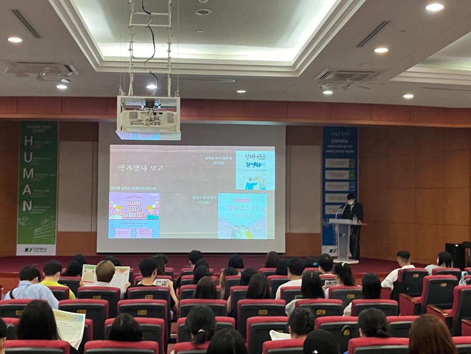 6월 23일 심리상담치료학과 종강총회&종강파티가 진행되었습니다. 한 학기를 마무리하며 학과의 다양한 소식을 전하는 종강총회를 진행했습니다. 이번 종강총회에선 1학기 학과 행사활동 보고, 국별보고, 대의원 활동 및 감사보고와 학과 건의사항 및 질문을 나누었습니다. 종강총회를 마친 뒤, 학과동기와 선후배간의 친목도모를 위한 종강파티를 진행했습니다. 코로나로 인해 지금껏 진행하지 못했던 학과 행사 중 하나인 종강파티를 임원들의 노력과 많은 학우분들의 참석으로 무사히 마칠 수 있었습니다.