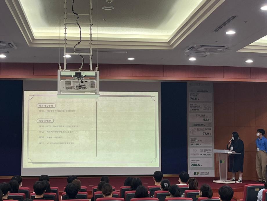 하계방학을 지나 새 학기를 시작하며 이번 학기 복학하는 복학생에 대한 소개와 학과 임원진 소개, 국별보고 사항 및 2학기 행사들에 대한 안내와 과방 이용안내 및 사물함 추가 이용에 대한 공지를 전달하였습니다. |