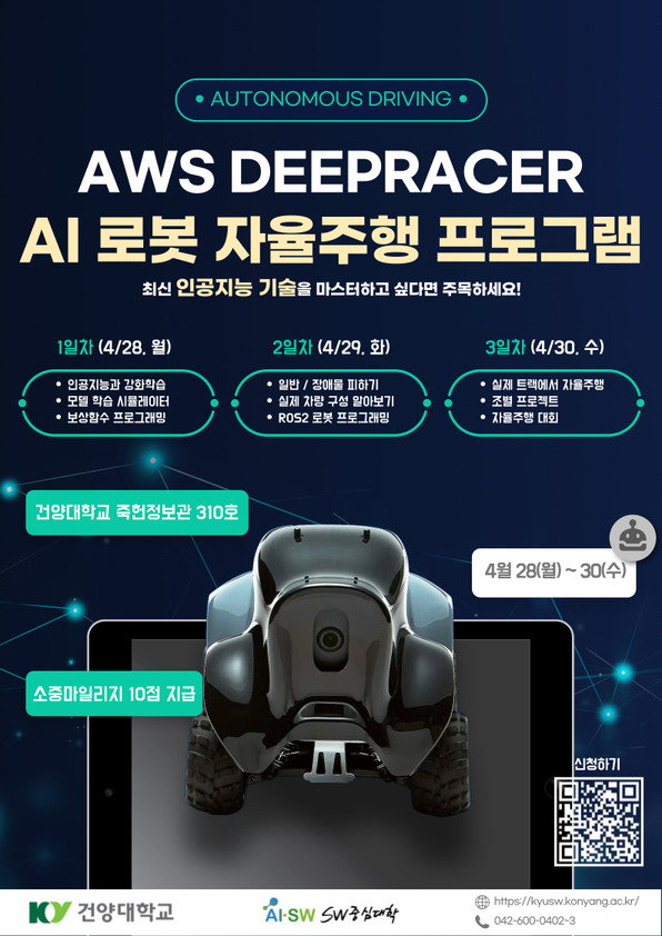 『 [SW중심대학]AWS DEEPRACER AI 로봇 자율주행 프로그램 』글의 상세내용을 확인하는 표로 제목, 부서명, 등록일, 조회, 첨부, 내용으로 나뉘어 설명합니다.