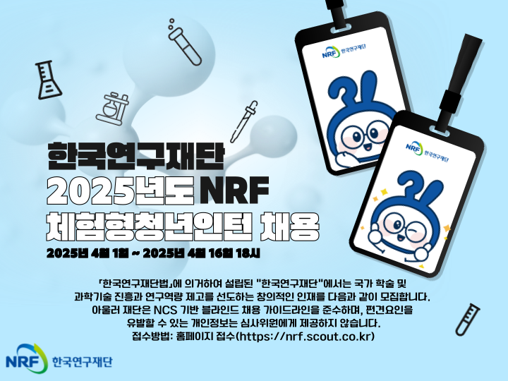 ※ 상기 전형 일정은 변동 가능, 응시자에게 단계별 합격여부 통보 □ 전형별 우대사항(가점) : [별첨-1] 참고□ 제출서류■ 입사 지원서, 직무능력 및 자기 소개서 서식 ■ 가점 대상자(국가유공자, 장애인, 비수도권 지역인재, 저소득층, 북한이탈주민, 다문화가족, 자립준비청년 등)에 한하여 면접전형 이전 증빙서류 제출 ■ 기타 추가 제출서류 필요시, 전형별 합격자에 한하여 제출목록 및 제출방법 별도 통보 □ 지원 접수 일정 및 방법■ 접수기간 : 2025.4.1.(화) ~ 2025.4.16.(수) 18시까지 (15일 간, 초일불산입) ■ 접수방법 : 인터넷 접수(https://nrf.scout.co.kr) ※ 우편‧방문으로는 응시원서를 접수 받지 않으며, 인터넷 접수 마감일에는 지원자 폭주로 접수가 되지 않을 수 있으므로 사전에 지원서 제출 요망 □ 체험형 청년인턴 지원 사항■ 취업시험 응시 및 취업박람회 참가 시 특별휴가 부여 ■ 30일(1개월) 이상 근무한 경우 경력증명서 발급 ■ 인턴과정 최종 수료자*에 한해 인턴 수료증 발급 * 근로계약기간 만근(7개월) 및 최종 성과평가 참여자 ■ 우수인턴 선발 시, 정규직 직원 채용 가점 부여 예정 ※ 선발 인원수는 인턴 성과평가계획 수립 시점, 재직 중인 체험형 청년인턴 인원의 20% 내외 ■ 우수인턴 선발 시 기관장 명의의 입사 추천서 발급 □ 채용서류의 반환■ 「채용절차의 공정화에 관한 법률」제11조 및 동법 시행령, 시행규칙에 따라 반환청구기간 내에 청구된 반환 청구분에 한하여 반환 ■ (반환대상서류) 채용과정에서 제출한 서류 일체 ※ 온라인 제출 서류 제외 ■ (반환청구기간) 채용확정일로부터 30일 이내 ■ (청구방법) 채용전형 홈페이지 Q&A에서 반환신청 □ 기타사항■ 분야별 지원자 중 채용대상자로 적격자가 없다고 판단되는 경우, 해당 분야에서 채용하지 않을 수 있음. ■ 응시원서 기재착오, 누락 등으로 인한 불이익은 당사자 부담으로 하며, 응시자가 제출한 응시원서의 기재 내용이 허위(증빙 접수 및 진위 확인 예정)로 판명될 경우에는 임용된 다음이라도 합격을 취소함. ■ 온라인 접수 시, 본인의 고의 및 과실 또는 착오로 가점* 여부를 오기재(또는 오선택)하여 증빙 확인이 불가할 경우, 차기 전형 기회를 미 부여함. * 국가유공자(보훈), 장애인, 지역인재, 저소득층, 북한이탈주민, 다문화가족, 자립준비청년 등 ■ 서류전형 시 입사 지원 서류 대상 AI 사전 검증을 통해 블라인드 위반, 표절 여부 등 검토 예정(적발 시 불합격 등의 불이익 발생할 수 있음) ■ 구비서류 등에 중대한 거짓이 밝혀진 경우 및 청탁 등의 부정한 방법으로 전형에 임한 경우에는 전형 결과를 취소할 수 있으며, 향후 5년간 응시를 제한함. ■ 입사지원서 등 제출 서류상에 개인 인적정보(출신학교, 출신지역, 가족관계, 사진 등) 관련 일체 기재 또는 부착을 금지함. ■ 전형 중 부정행위는 전형 단계별로 무효 처리하며, 임용 후 적발되는 경우 탈락 처리함. ※ (부정행위) 본인 또는 타인의 부당 · 위법한 방식으로 인해 평가의 공정성을 해하거나 또는 해할 우려가 있는 일체의 행위를 말하며, 그 부정행위가 합격 여부에 영향을 미치지 아니하였어도 부정행위에 해당될 경우 합격 및 근로계약의 취소사유에 해당함 ■ 국가유공자, 장애인, 비수도권 지역인재, 저소득층, 북한이탈주민, 다문화가족, 자립준비청년을 우대함. ※ 국가유공자의 경우 관련 법(국가유공자법 제31조) 및 지침에 따라 법정가점 부여 여부 결정 ■ 장애인 응시자의 경우 입사지원서 제출 시 장애인 편의지원 신청 가능 [별첨-4] 장애인 응시자 편의지원 신청 안내문 참조 ■ 각 전형 단계별 평가점수가 60점 미만(가점 불포함)인 지원자는 전형 단계별 선발 배수와 무관하게 탈락 처리함. ※ 단, 국가유공자의 경우 「국가유공자 등 채용시험 가점제도 관련 가이드라인」에 따라 가점 별도 적용(채용분야가 가점 적용대상인 경우 100점 만점의 40점 이상 득점 시 가점 적용하여 국가유공자 가점을 포함한 점수가 60점 미만인 경우 자동 탈락 적용) ■ NCS기반 블라인드 채용 기준을 준수하며, 응시자의 출신지역, 가족관계, 학력 등 직무수행능력과 직접 관련이 없는 인적 사항에 대한 정보를 요구하지 않으며 면접에 참고 자료로 활용하지 않음. ■ 채용 전형 간 블라인드 사항(성명, 성별, 연령, 출신지역 및 학교, 전·현 소속기관명 등) 위반 시 불합격 등의 불이익이 발생할 수 있음. ■ 전형 단계 시 4촌 이내 친족 근무 여부 확인서 및 부정합격 시 임용이 취소될 수 있음을 명시한 확인서를 징구할 수 있음. ■ 재단은 직원 채용과 관련하여 인사 청탁을 일체받지 않으며, 청탁, 압력, 뇌물의 행사 등을 통한 채용 비리가 적발되었을 경우, 부정한 방법으로 합격한 자에 대해 합격 취소, 징계 사법처리 등의 불이익이 발생할 수 있음. ■ 채용 과정에 감사 업무 담당자가 참여하고, 감사 및 채용비위 피해자 구제를 위해 채용 관련 문서 일체는 영구 보관하여 채용 과정의 공정성 기조를 유지함. ■ 채용 절차의 공정화에 관한 법률에 근거하여 채용서류 반환 요구 가능함. ※ 단, 온라인 접수서류는 해당사항 없음 ■ 대내·외 상황변화에 따라 채용인