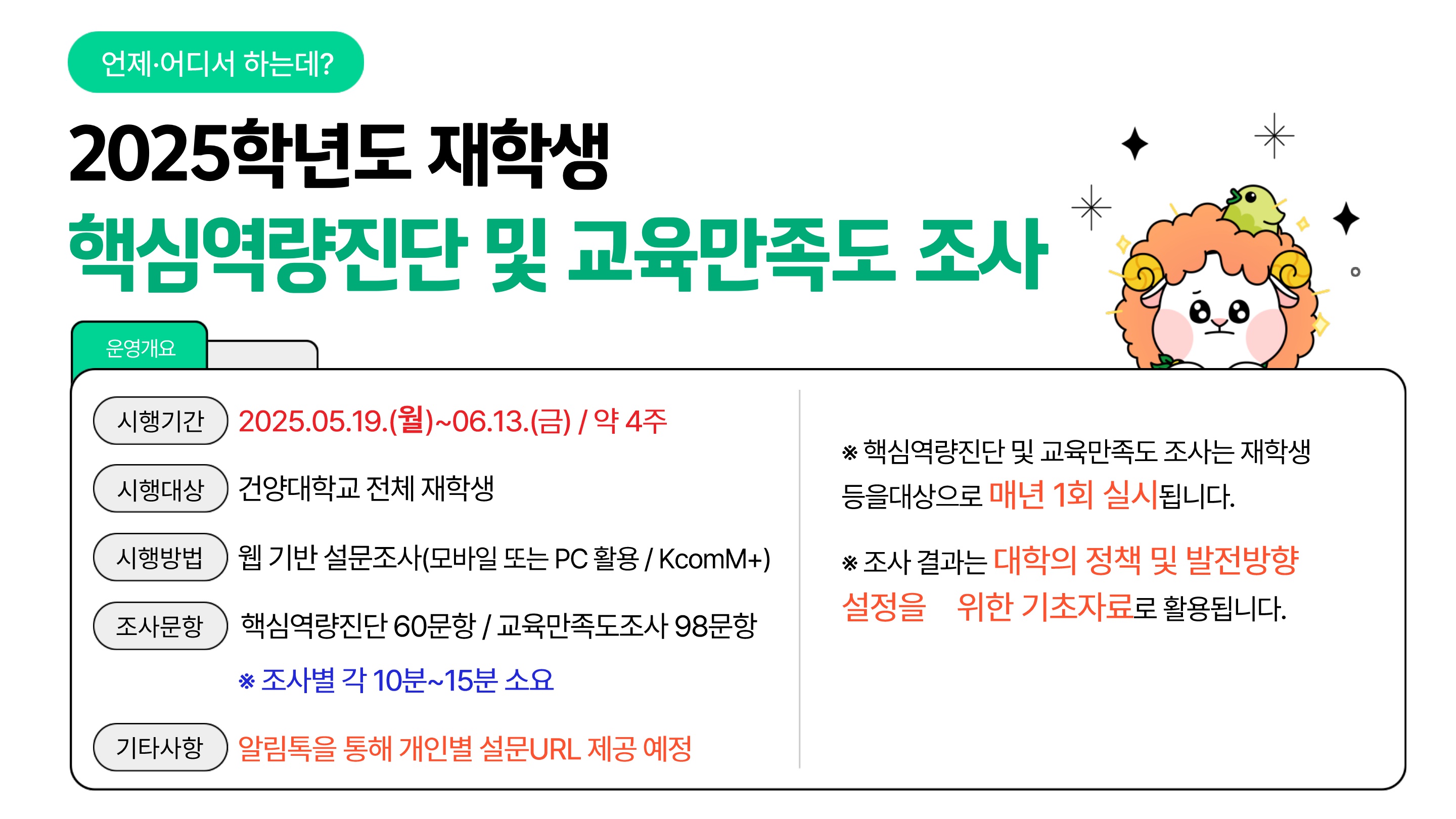 『 2025학년도 건양대학교 재학생 핵심역량진단 및 교육만족도 조사 안내 』글의 상세내용을 확인하는 표로 제목, 부서명, 등록일, 조회, 첨부, 내용으로 나뉘어 설명합니다.
