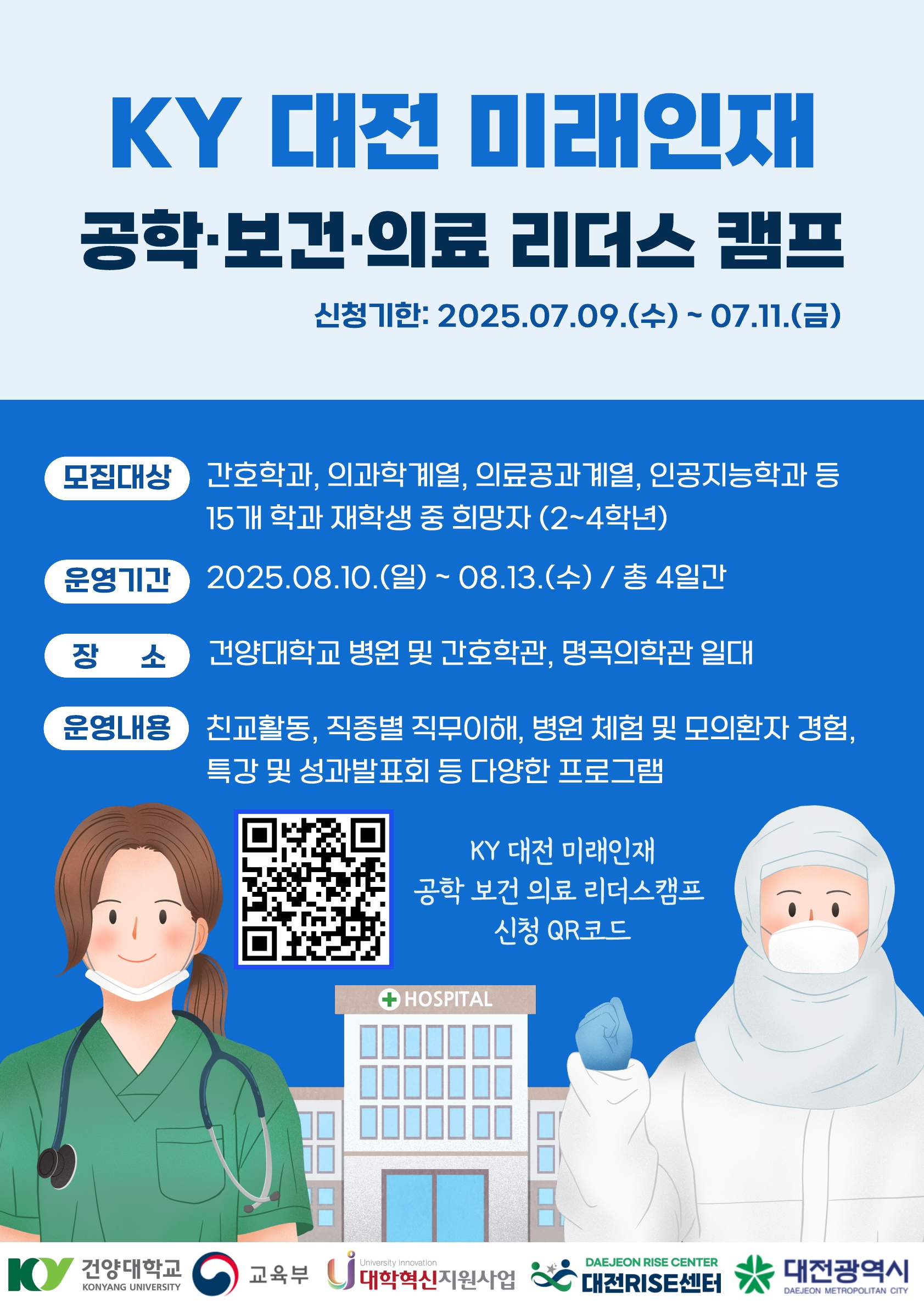 『 KY 대전 미래인재 공학 보건 의료 리더스캠프 학생 모집 안내 』글의 상세내용을 확인하는 표로 제목, 부서명, 등록일, 조회, 첨부, 내용으로 나뉘어 설명합니다.