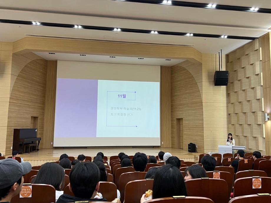 2023년도 2학기가 시작되었습니다. 이번 개강총회는 앞으로 학기간의 행사와 교수님을 소개하는 자리가 되었습니다. 남은 한학기도 잘 마무리하는 경영학부가 되기를 응원합니다!