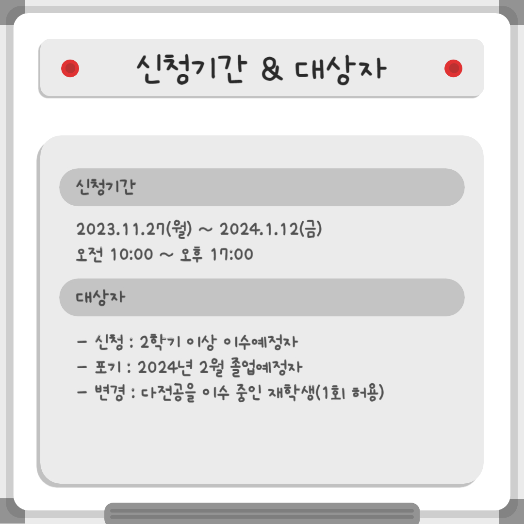 | 제목 | [안내] 2024-1학기 다전공 및 부전공 신청 및 정정 안내 | ||||