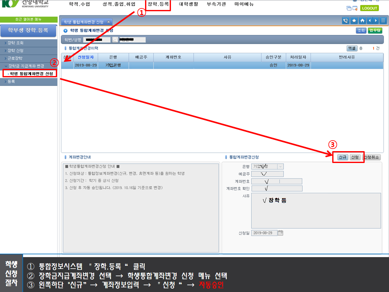 장학금 지급계좌 신청(변경) 등록 방법 안내 □ 장학금은 학생 통합정보시스템에 등록된 학생 개인별 계좌번호로 지급됩니다.
