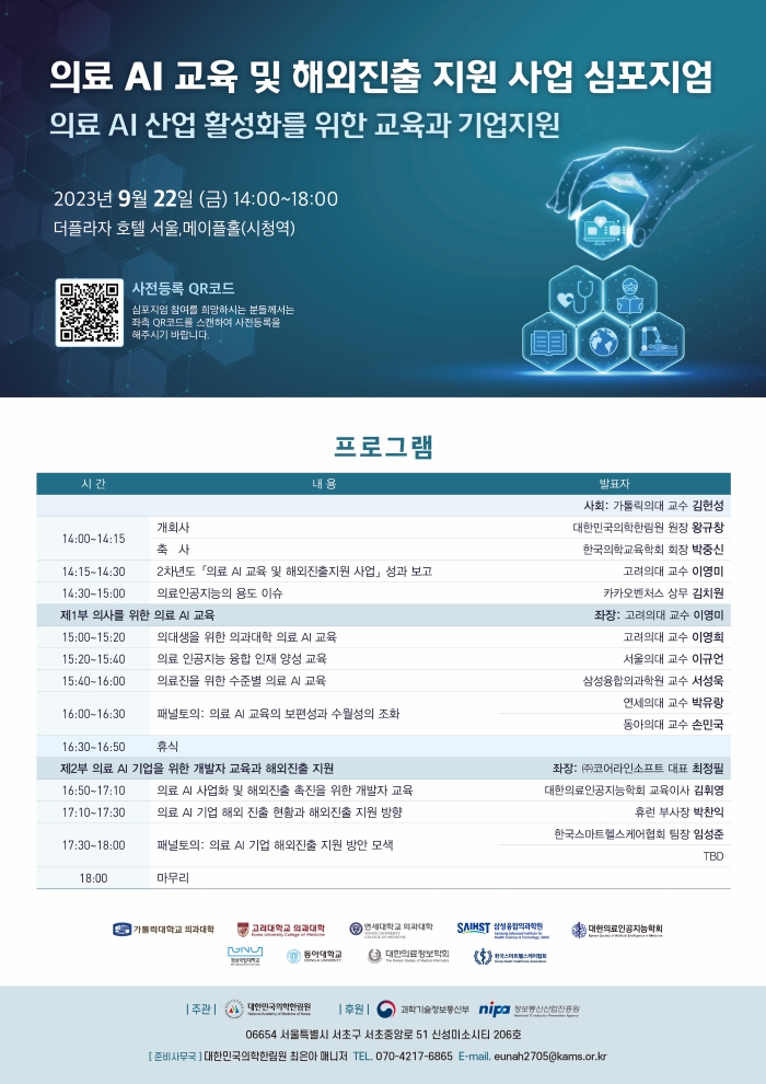 | 제목 | [의학한림원] 의료 AI 교육 및 해외진출 지원 사업 심포지엄 | ||||