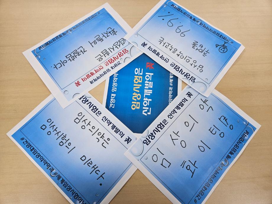 임상시험은 정부가 차세대 전략산업으로 육성지원 중인 제약바이오산업의 핵심가치인 신약을 개발하는 과정에 있어서 핵심적인 연구개발단계입니다. 신약개발 임상연구전문가 양성을 교육목표로 하는 건양대 임상의약학과는 재학생들과 함께 임상시험의 중요성과 가치를 고취시키고자 다음과 같이 “임상시험은 신약개발의 꽃” SNS 해시태그 캠페인을 진행합니다. [캠페인 참여 방법] 1) 캠페인 일정: 2024년 5월 8일-5월 20일 2) 대상: 누구나 3) 메시지보드를 출력하여 임상시험 홍보 메시지 작성 → 인증샷 촬영 4) 필수 해시태그(#건양대임상의약학과, #세계임상시험의날, #@kyu_clinical_medicinal)와 함께 본인의 인스타그램 혹은 페이스북에 올림 5) 인증 사진과 개인정보(이름, 전화번호)를 작성하여 이메일 전송(clinicalmed@konyang.ac.kr) 추첨을 통해 당첨되신 분들에게는 소정의 경품이 제공됩니다(총 30명). 많은 참여 바랍니다. 감사합니다. 관련문의) 041-730-5320