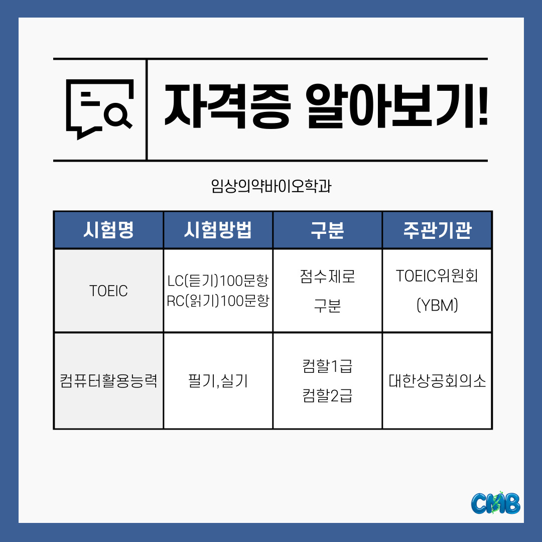 『 [카드뉴스] 임상의약바이오학과 자격증 소개 』글의 상세내용을 확인하는 표로 제목, 부서명, 등록일, 조회, 첨부, 내용으로 나뉘어 설명합니다.