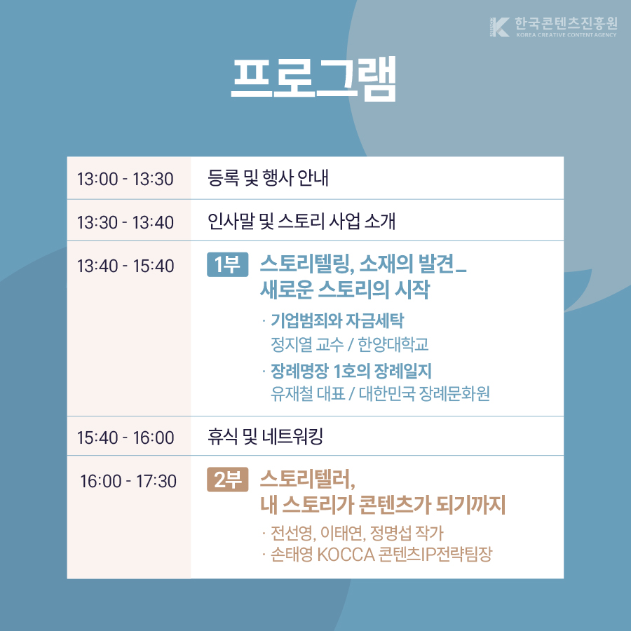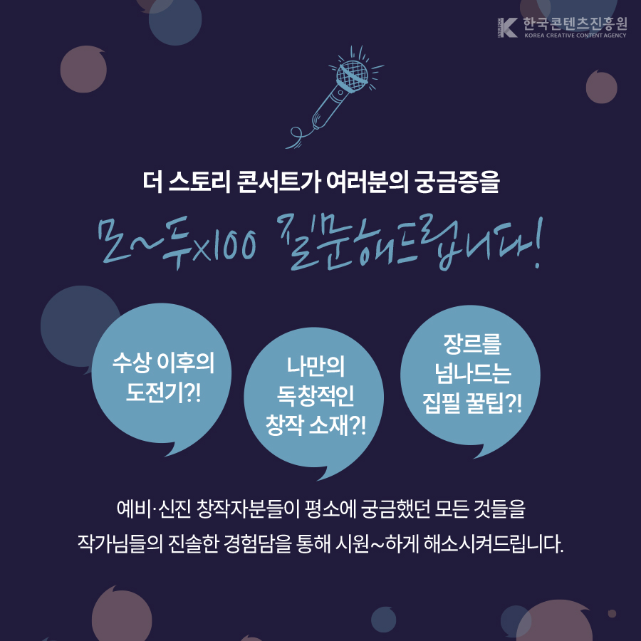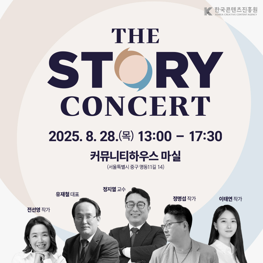 문화체육관광부와 한국콘텐츠 진흥원이 주최·주관하는 <2025 더 스토리 콘서트>에 초대합니다! ? 창작의 첫 걸음을 떼려는 예비창작자 ? 현직 작가들의 생생한 경험과 노하우를 배우고 싶은 분 ? 창작물을 사업화 하는 과정에 대한 궁금증이 있는 분 예비·신진 창작자분들이 궁금했던 모든 것들을 작가님들의 경험담을 통해 해소시켜드립니다. 참가 신청 페이지? https://forms.gle/KHdEA83T3qdTTbvR6